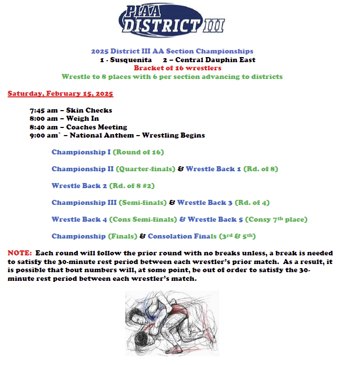 2026 PIAA D3 AA Section I Susquenita High School 309 Schoolhouse Road Duncannon, PA 17020 |